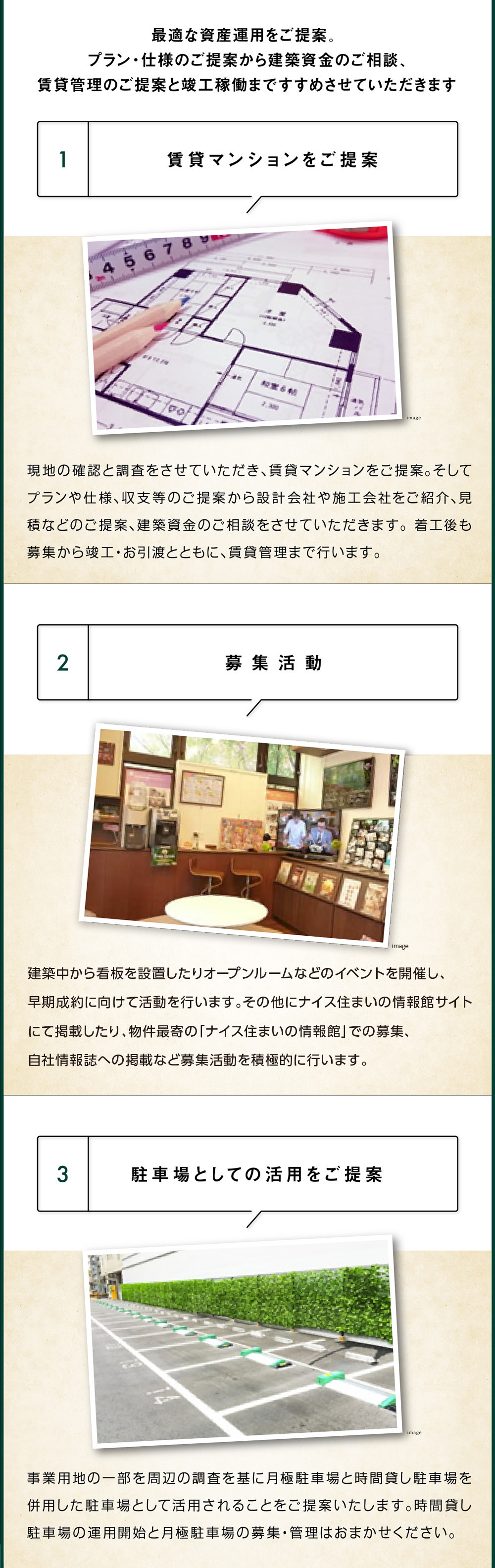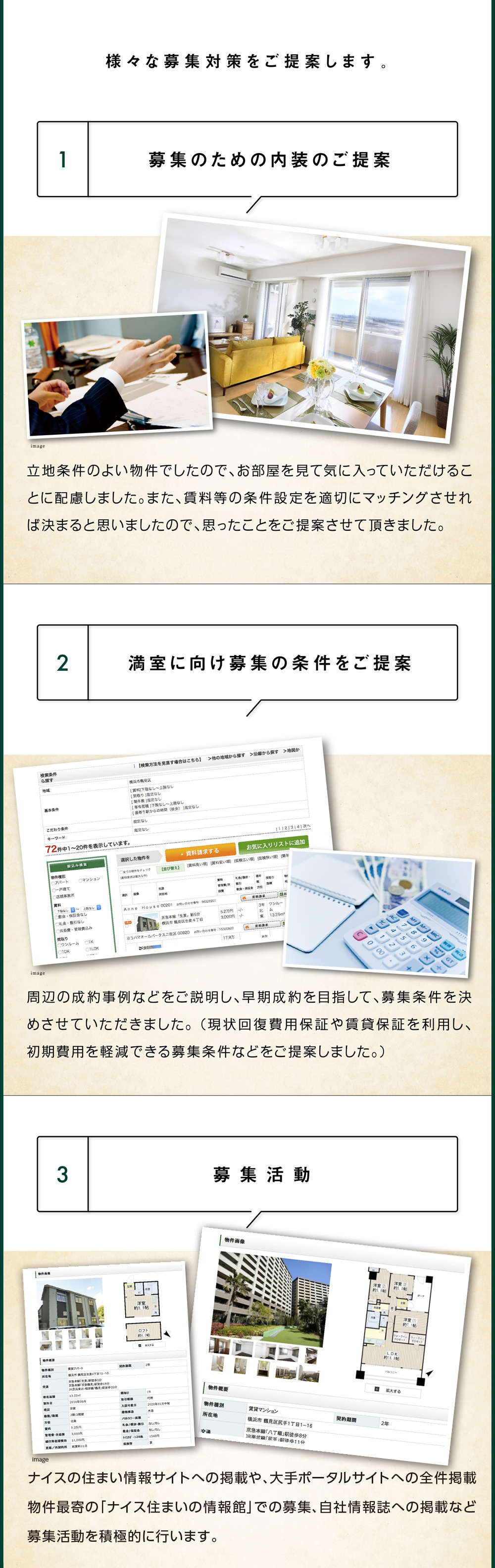 また、直近の賃貸動向、相場変遷も理解しており、お客様のいつから貸したいなどのご賃貸事情とマーケットの状況を鑑みた最適な販売戦略を立案させていただきます。